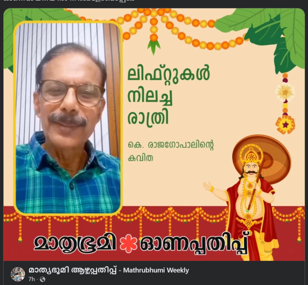 Videos ലിഫ്റ്റുകള് നിലച്ച രാത്രി : മാതൃഭൂമി ഓണപ്പതിപ്പില് കെ. രാജഗോപാലിന്റെ കവിത വായിക്കാം August 29, 2025 By ratheeshvenu ഓണവായനയിൽ നിങ്ങളോടൊപ്പം… – Kandakkappallil Rajagopal | Facebook 👆 വീഡിയോ കാണുക Share FacebookTwitterPinterestWhatsApp Stay in the Loop Get the daily email from CryptoNews that makes reading the news actually enjoyable. Join our mailing list to stay in the loop to stay informed, for free. SubscribeI've read and accept the Privacy Policy. Latest stories Audio മാലാഖമാരുടെ കൈയുറകൾ : കെ. രാജഗോപാലിന്റെ കവിത വായിക്കാം ratheeshvenu - November 21, 2025 AWARD വയലാർ അനുസ്മരണം – കസവ് (കാരയ്ക്കാട് സാംസ്കാരിക വേദി) ratheeshvenu - October 24, 2025 Works മണങ്ങളേ മതിയായില്ല ratheeshvenu - September 23, 2025 Works കഥാഗതൻ ratheeshvenu - September 23, 2025 Works രുചിവണ്ടി ratheeshvenu - September 23, 2025 - Advertisement - You might also like... Audio മാലാഖമാരുടെ കൈയുറകൾ : കെ. രാജഗോപാലിന്റെ കവിത വായിക്കാം ratheeshvenu - November 21, 2025 Videos NbSP (Narendrabhooshan Smaraka Prathistapanam) Narendra Dayanandam.- Day 100 – 29 Aug 2025 ratheeshvenu - September 2, 2025 Videos കവിതാ വായന എസ് കെ. രാജഗോപാൽ | സംഗീത ബാർവെ | വിദ്യാ ഹെഗ്ഡെ| നേഹ |അനാമിക അനു | അക്കൂൺ സിംഗ് | കനക ഹമ ratheeshvenu - August 15, 2025