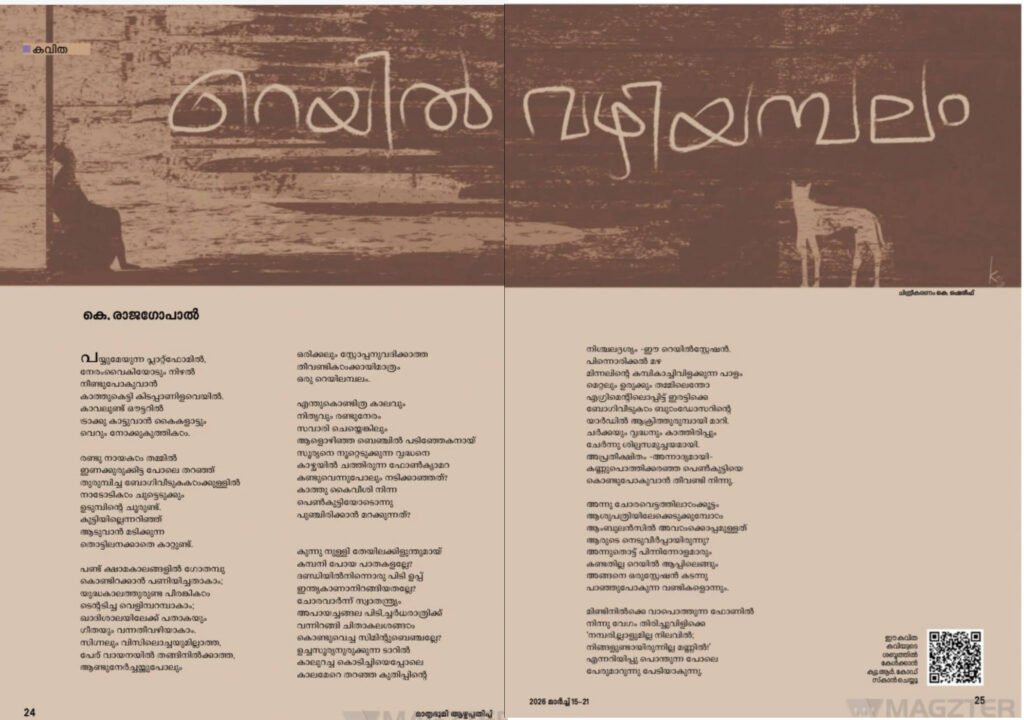 തീവണ്ടികൾ നിർത്താത്ത ഒരു പഴയ റെയിൽവേ സ്റ്റേഷനെ കാവ്യാഖ്യാനേന്ദ്രജാലത്താൽ റെയിൽവഴിയമ്പലമെന്ന ഇൻസ്റ്റലേഷൻ കലയാക്കി പരിവർത്തിപ്പിക്കുകയാണ് കവി കെ രാജഗോപാൽ. പല ഫ്രെയിമുകൾ ചേർത്ത് കാലത്തെയും സ്ഥലത്തെയും പല അനുപാതത്തിൽ ഒന്നിപ്പിച്ച് ഒരു ബൃഹദ്രൂപം കൺമുന്നിൽ നിർമ്മിച്ചുതരുന്നു. അതിലേക്ക് തീവ്രമായ ലാവണ്യാനുഭൂതികളോടെ കടന്നുചെല്ലാം നമുക്ക്. കലയുടെ ആവാഹനപ്രഭാവത്തിൽ അലിയാം. വസ്തുബോധത്തിന്റെ കൃത്യത മുഴച്ചു നിൽക്കുന്ന അളവും അറിവും ചരിത്രഘട്ടങ്ങളിലേക്ക് വലിച്ചടുപ്പിച്ചു എന്നുവരാം. രൂപകങ്ങളുടെ വിന്യസന വിശേഷം ഭാവാർത്ഥത്തെ അതിന്റെ രൂപത്തിൽനിന്നും വിമുക്തമാക്കി അലസസഞ്ചാരത്തിന് അയച്ചു എന്നുവരാം. ഒരിൻസ്റ്റലേഷൻ കല അങ്ങനെയൊക്കെയാണ് നാം കണ്ടുതീർക്കുന്നത്.